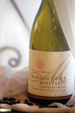 Gewurztraminer is a unique Germanic style favorite and Morgan Creek's signature wine! Gewurz means spice in German. Taste exotic fruit flavors with a peppery character, a great wine to sip or serve with pork, barbecue or Asian cuisine. Served hot from the European outdoor oven is Morgan Creek's famous ""schnitzel brot"" made with locally produced beer sausage and cheeses.